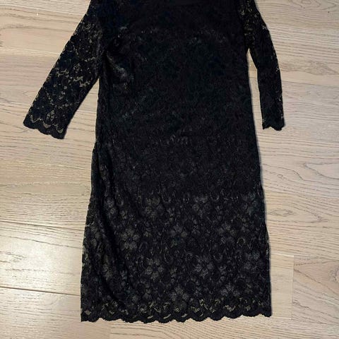 ASOS festkjole i størrelse 42. Kjolen er svart og laget i polyester. Ytterlaget har blondestruktur med 3/4-lange ermer, og det følger med underkjole i matchende farge. Passer til bruk ved fest og andre anledninger der en enkel, mørk kjole ønskes.