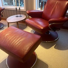 Ca 1 år gammel , lite brukt, mørk brun skinn stressless med fotskammel. Nakkestøtten kan reguleres i høyden, sving og nedfallbar rygg. Kjøps hos Bohus for kr 36000,-