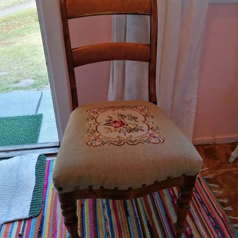 Antikke spisestuestoler med flotte håndbroderte seter