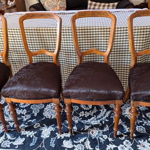 Antikke spisestuestoler med flotte håndbroderte sitteputer. 85 cm høye og 45 cm på det bredeste. 5 stoler til sammen der 3 og 2 stoler er like. Brukt samlet som spisestuestoler. Trenger noe kjærlighet, en stol må limes sammen på siden av setet (se bilder). Sitteputene kan tas ut eventuelt trekkes om. Selges samlet for 650kr til sammen.