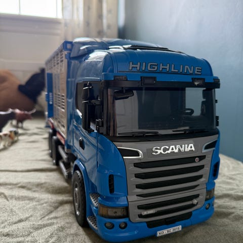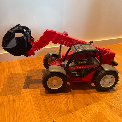 Bruder traktor med tilhenger i grønn og gul plast. Leken består av en traktor med store dekk og førerhus med detaljer i interiøret, samt en tilhenger med lasteplan. Tilhengeren er festet bak traktoren og er egnet for frakt av små leker eller andre lette gjenstander i lek. Passer som lekekjøretøy for barn som liker landbruk og anleggskjøretøy.