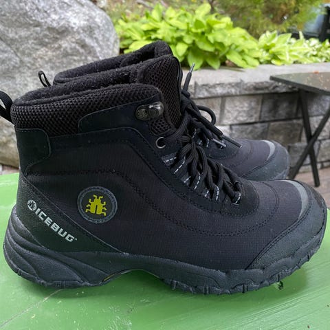 Icebug vinterstøvler i størrelse 39. Støvlene er svarte og har grov yttersåle med pigger for godt feste på glatt underlag. Overdelen er i et robust materiale med glidelås i siden og elastisk felt for enklere av- og påtaking. Modellen er ankelhøy og egnet til bruk i vinterforhold i hverdagen og ved gåturer på snø og is. Det er 17 pigger i karbinstål i hver sko. Selges med gulvbeskytter ny/ubrukt kr.349