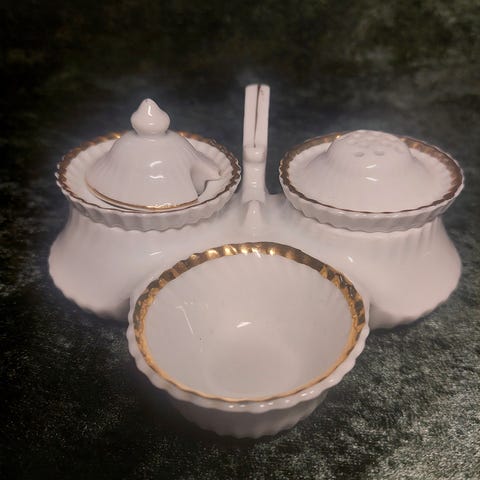 Victoria China asjetter i porselen med fruktmotiv., laget i Tsjekkoslovakia, stempel under ble brukt mellom 1918-1939.Tallerknene er hvite med dekor langs kanten og gullkant. Motivene viser ulike frukter i farger. Egnet som dessert- eller kakeasjetter, til servering eller som pynt i vitrineskap.
