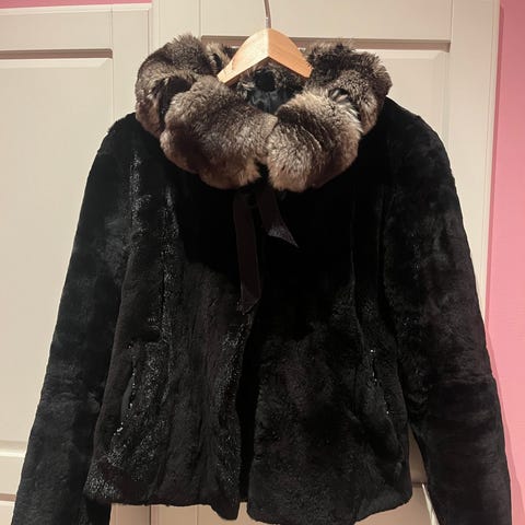Brukt en del men veldig pent, ingen skader. Ekte pels (kanin), myk og varm å ha på seg. Str 38.
