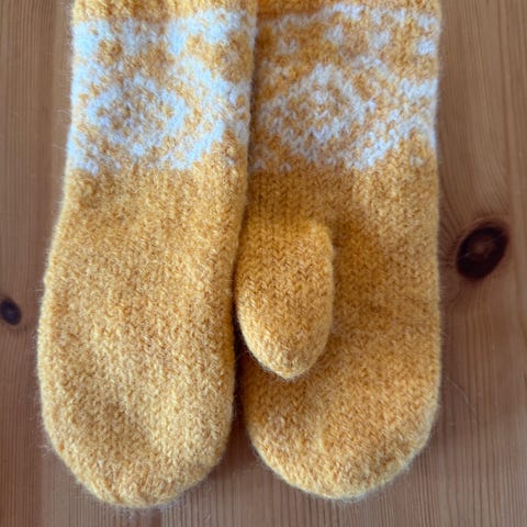 Votter strikket i Fritidsgarn, 100 % ull, og tovet.