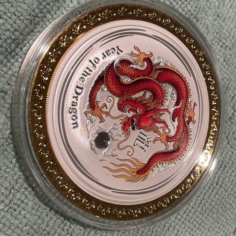 Dette er den ettertraktede Year of the Dragon 2012 i 10 troy ounces (.999 rent sølv) med original fargeapplikasjon og skjelden dekorativ gullring utgave.