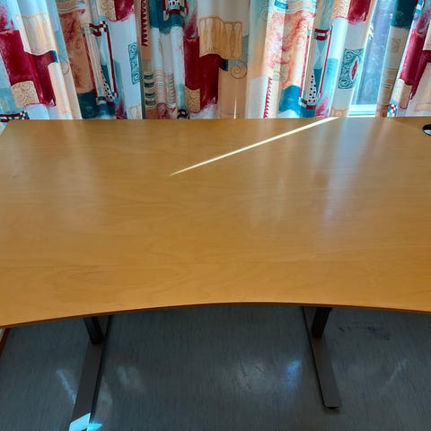 Skrivebord i treimitasjon med metallben. Bordet har hovedplate med utsparing, uttrekkshylle som egner seg til tastatur eller ekstra utstyr, samt en fast hylle under for oppbevaring. På høyre side er det en skuff og en ekstra hylle nederst som kan brukes til for eksempel PC-tårn eller annet utstyr. Egnet som arbeidsbord eller PC-bord i hjemmekontor, ungdomsrom eller stue.