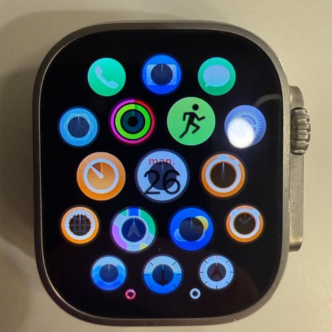 Apple Watch Ultra smartklokke med 49 mm urkasse i titan og grønn silikonrem. Klokken har rektangulær skjerm og digital krone på siden. På baksiden sitter sensorer for pulsmåling og annen helserelatert registrering. I annonsen følger det med flere utskiftbare remmer i ulike farger og materialer, samt magnetisk ladeenhet med kabel. Egner seg til bruk med kompatible Apple-enheter for varsler, trening, aktivitetssporing og daglig tidsvisning. Lite brukt. Fremstår som ny. Kjøpt 23.10.25.