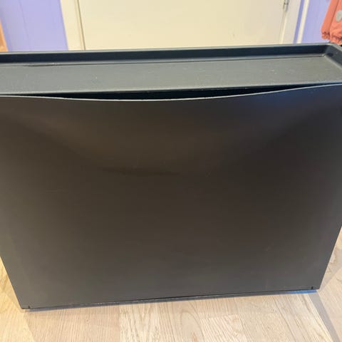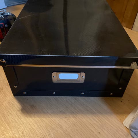 Totalt 3 oppbevaringsesker i papp. Brukt til å oppbevare klær. En av eskene har et hvitt merke, se bilder. De andre er fine, men noen mindre bruksmerker. Eskene har bredde 35 cm, dybde 50 cm og høyde 30 cm. Eskene er demonterte.