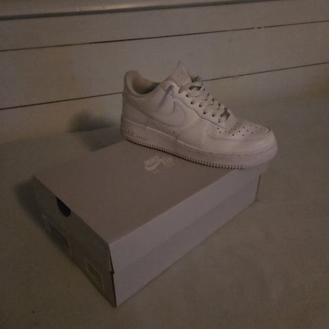 Nike Air Force 1 sneakers i størrelse 42. Modellen har lav profil med overdel i svart materiale og hvit yttersåle. Klassisk Nike-logo på siden og hælen. Egnet som hverdagssko og fritidssko.