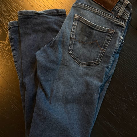 Jacob Cohën jeans for herre i blå denim. Buksen er laget i bomull og har livvidde W38 og størrelse M. Klassisk femlommers modell med glidelås og knapp i front. Passer til hverdagsbruk og kan kombineres med både skjorte og t-skjorte.
