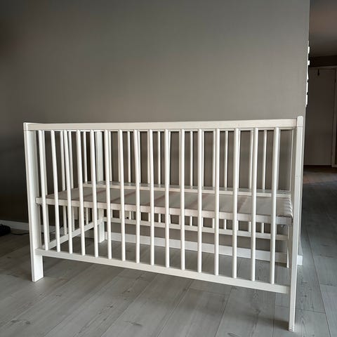Noe slitasje på tekstilet kan forekomme, dette er fettmerker etter Purelan (ammesalve) - se bilder for detaljert tilstand. Forsøkt vasket vekk uten hell. Sengen har kun vært oppbevart tørt innendørs.