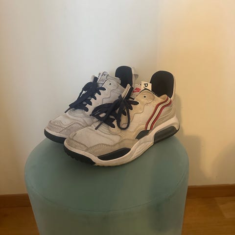 Air Jordan sneakers i størrelse 39. Joggesko med flerfarget overdel i kombinasjon av mørke og lyse toner med kontrastfelt. Modellen har snøring foran, polstret hælparti og gummisåle som gir godt grep. Passer til hverdagsbruk og fritidsaktiviteter.