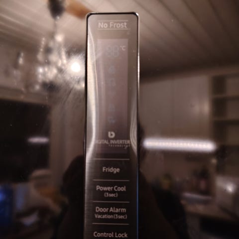 Samsung kjøleskap i hvit utførelse. Frittstående modell med frontdisplay på døren og vertikalt håndtak. Passer til plassering på kjøkken som vist på bildene. Nærmere spesifikasjoner som modellbetegnelse, volum og mål er ikke oppgitt i annonsen.
