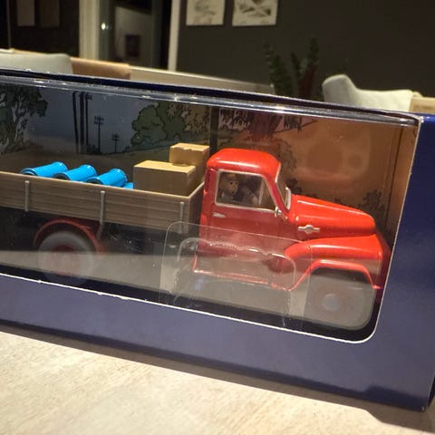 Disney Tintin En Voiture Le Camion Rouge L’Île Noire lekebil i rød farge. Modellen er en Hanomag L28 lastebil fra 1950‑årene, kjent fra albumet L’Île Noire (1956). Lastebilen leveres i original eske med vindu og har last på planet. Egnet som samleobjekt eller lekebil for barn som liker Tintin-universet og kjøretøy i miniatyr.