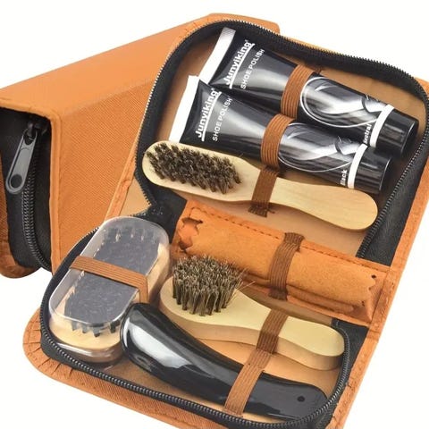 Selger en stor pakke med diverse produkter for skopleie og vedlikehold.