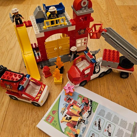 LEGO DUPLO klosser blandet med rød byggeplate. Settet inneholder ulike typer og farger av store DUPLO-klosser samt enkelte kjøretøydeler. Passer til fri bygging og lek for små barn som bruker DUPLO-systemet.