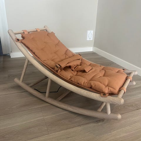 Charlie Crane Vippestol for barn med treunderstell og polstret sete i tekstil. Stolen har integrert sele for å holde barnet på plass og buet understell som gir vuggende bevegelse.
