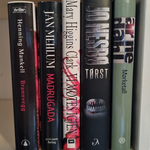Bokpakke med flere titler av ulike forfattere innen krim, spenning og dokumentar. Blant bøkene som vises på bildene er blant annet romaner av Freida McFadden, Lisa Jewell, Lee Child, Jørgen Jæger, Unni Lindell, May Lis Ruus, Romy Hausmann, Bjørn Godøy m.fl. Noen er synlig brukt og noen er ulest.