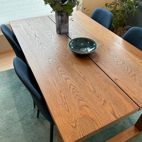 Spisebord med to ileggsplater. 270 cm med plater, 170 cm uten. Metallbein. Bordet er godt brukt og har noen synlige merker på flaten og på kanter. Fint med duk eller sol ekstrabord i selskap.