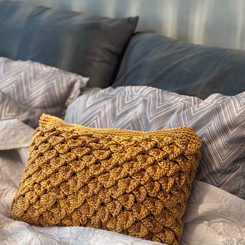 Supertøff og unik heklet pute i 3D mønster. Glansfullt garn i sprudlende knæsj rosa med glans. Ganske tung. Følels veldig eksklusiv.