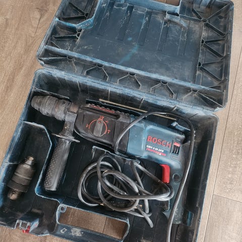 Til salgs: en lett brukt Bosch GBH 2-23 REA slagbormaskin med støvavsug og boretetningssett. Settet inneholder også et stort antall bor, som vist på bildene.