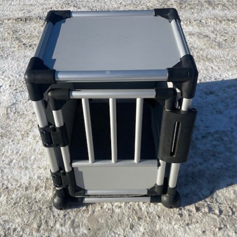 Hundebur for bil i aluminium. Buret har skrå bak- og frontside som gjør det egnet for plassering i bagasjerom. Døren foran har gitterkonstruksjon for god lufting, og sidene er tette paneler. Rammeverk i metall med plastbeslag i hjørnene gir stabilitet. Egnet for transport og sikring av hund i bil.