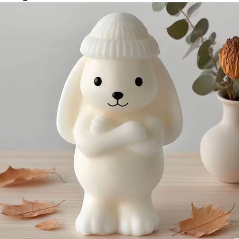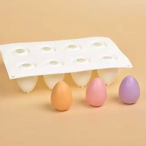 Silikonformer sett med påskehare- og eggformede lysformer i hvit silikon. Settet består av flere ulike former med rillet overflate, blant annet eggformede og kanin-/hareinspirerte varianter med ører eller kropp i flere deler. Formene har åpning på toppen og kanal i bunnen til veke, tilpasset støping av lys eller andre støpeprosjekter. Størrelsene på formene varierer, med høyder rundt 8–9 cm og bredder rundt 5–6 cm, som vist på bildene. Egnet til bruk med stearin, voks eller annet støpemateriale innenfor silikonens tåleevne.