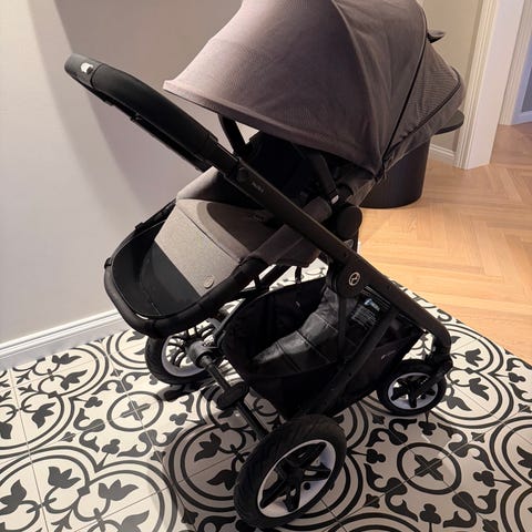 Cybex sportsvogn i svart farge. Vognen har tre hjul med stort forhjul og to større bakhjul. Setet har justerbar rygg og fotstøtte, samt fempunktssele. Det er kalesje med forlengelse og lufting, og en romslig varekurv under setet. Håndtaket har håndleddsstropp for ekstra sikkerhet. Egnet som sportsvogn til hverdagsbruk og turer på variert underlag.