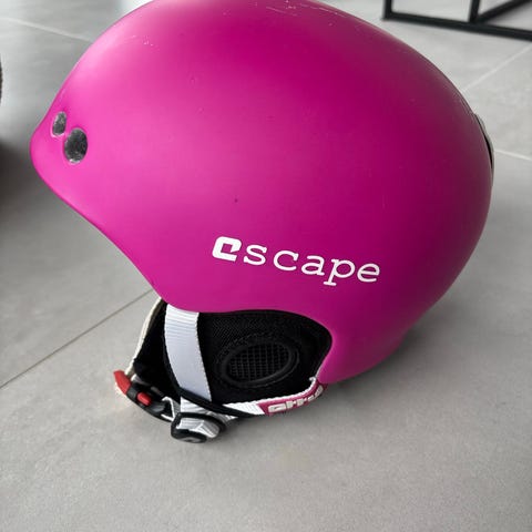 Escape skihjelm i rosa farge med tilhørende skibriller. Hjelmen har øreputer, ventilasjonshull i front og justerbar hakereim med klips.