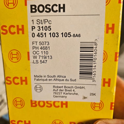 Bosch P7166 oljefilter, Bosch tennplugg og Bosch A8645 Filter+ Pro kupéfilter.
