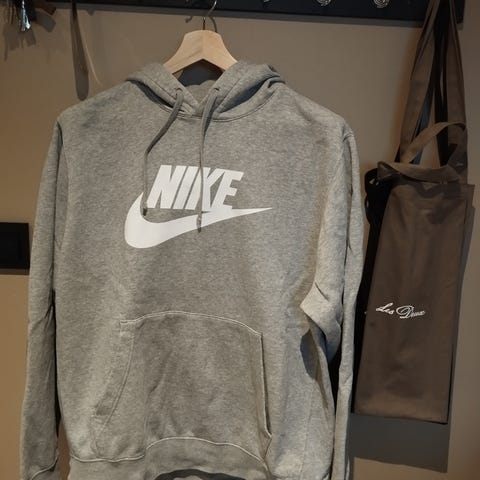 Nike hettegenser for herre i størrelse L. Genseren er grå og laget hovedsakelig av bomull. Klassisk modell med hette med snøring, kengurulomme foran og liten Nike-logo på brystet. Myk, børstet innside for økt komfort. Passer til hverdagsbruk og fritid.