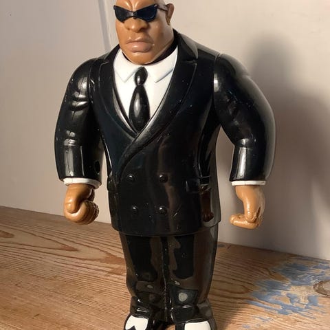 Plastfigur med hjul under, utformet som en tegneserieaktig karakter med lilla overdel og oransje detaljer. Leken kan trilles bortover på flate underlag ved hjelp av hjulene på undersiden. Egner seg som liten lekebil/figur for barn eller som samleobjekt. Materiale: plast. Farger: hovedsakelig brun, lilla og oransje.Fra Disney filmen:Chicken Little fra 2005.