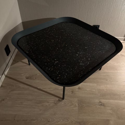 En ripe i bordplate, men blir lett borte om man vil pusse ned bordplata og behandle med det man ønsker. Tungt og fint bordplate som står stødig på gulvet.