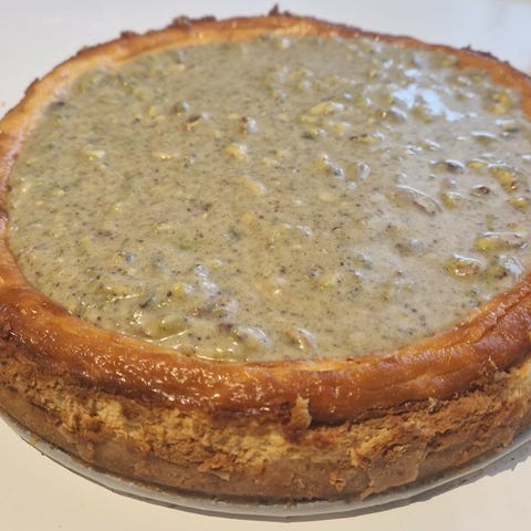 Hjemmelaget rund ostekake. Kaken har kremet konsistens og er stekt med gyllen og lett brent overflate. Egner seg som dessert eller kaffekake.