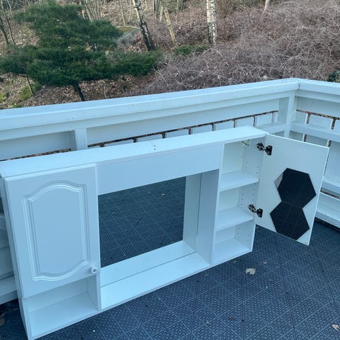 Baderomsinnredning med servantskap speil og høyskap i lys tre og hvit