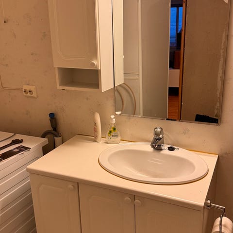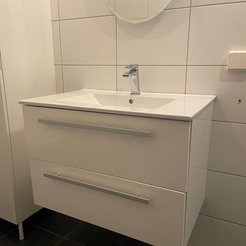 Baderomsinnredning bestående av servantskap med servant og armatur, speil med lys og smalt høyskap. Servantskapet har lys trefinér med flere skap og en skuff for oppbevaring. Servanten er hvit med integrert benkeplate og ett-greps blandebatteri. Over servanten er det et rektangulært speil med lysarmatur montert på toppen. I tillegg følger et smalt høyskap i hvitt og lyst tre med åpne hyller øverst og skapdør nederst, egnet for oppbevaring av baderomsartikler. Innredningen er tilpasset montering på bad og gir kombinert vaskeløsning og oppbevaringsplass.
