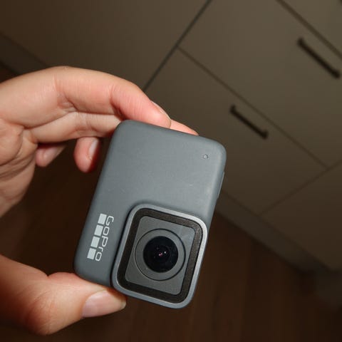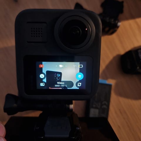 GoPro Max actionkamera i svart. Kameraet er et 360-graders actionkamera med linser på begge sider og montert på standard GoPro-feste, egnet for bruk med ulike braketter og tilbehør. Passer til opptak av video og bilder i ulike aktiviteter som tur, sport og hverdagsbruk. Kameraet har integrert skjerm på den ene siden og kontrollknapper på huset.