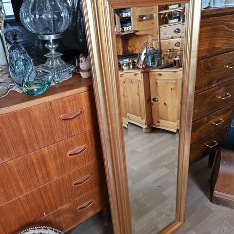 Vintage veggspeil med lysestake i brunt tre. Speilet er rektangulært med buet topp og er montert på en treplate med utskårne detaljer. Nederst er det festet en metallholder for lys. Baksiden har oppheng for veggmontering.