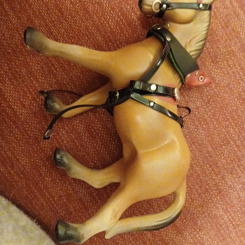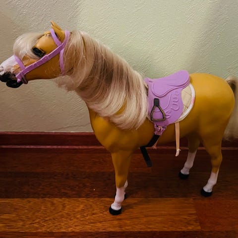 Sindy westernhest med tilhørende dukke og utstyr selges.