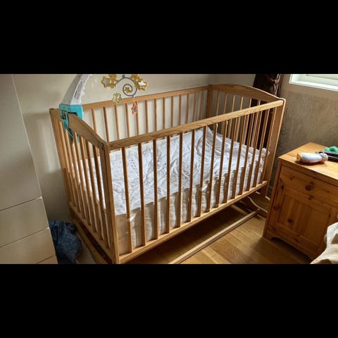 Borup sprinkelseng i tre med grønn overflate og malte dekorasjoner på gavlen. Sengen har klassisk sprinkeldesign med faste sider og justerbar bunn med ribber. Over sengen er det montert en tekstilhimmel i lys farge. Egnet som seng til baby og småbarn på barnerom eller soverom. Materialet fremstår som lakkert treverk. Madrass følger med på 140x70