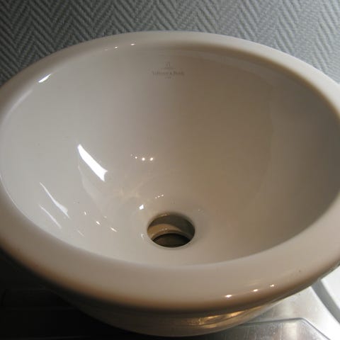 D: 27 cm. H: 17 cm. Vasken er som ny og vannlås medfølger+ veggfester.