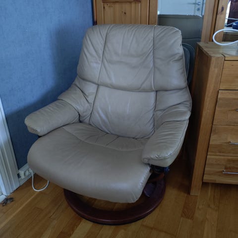 Beige lenestol med nedfellbar rygg og fothviler.