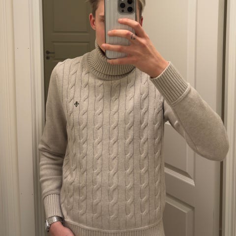 Pent og lite brukt genser. Ble revet i tråder noen steder i vaskemaskin en gang. Er sydd hos skredder og ikke noe som vises av feil nå, som vi kan se i alle fall