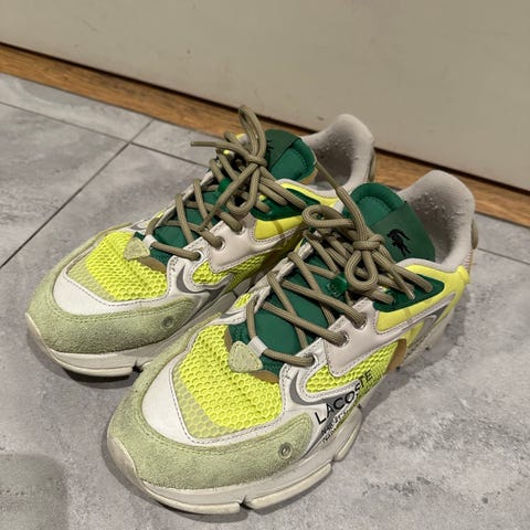 Lacoste joggesko i størrelse 44. Skoene har overdel i pustende mesh med syntetiske detaljer og snøring foran. Fargen er hovedsakelig hvit med lysegrønne detaljer. Yttersåle i gummi gir grep mot underlaget. Egnet som lette joggesko eller til hverdagsbruk.