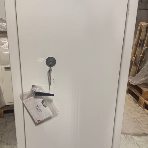 Sikkerhetsskap selges billig. Skapet har en en skikkelig lås og ferdige hull til å bolte skapet fast. Følger kun med én nøkkel fra SECU og det er noen kosmetiske riper i lakken.