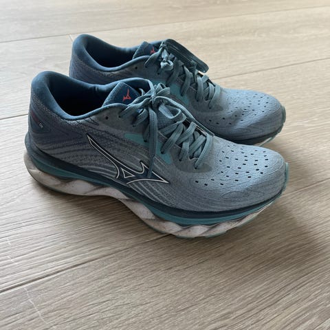 Mizuno løpesko for løping i størrelse 43. Skoene har overdel i pustende mesh i grå og blå nyanser med mørke lisser. Yttersåle i gummi med mønster for grep og slitestyrke, samt demping i mellomsålen for komfort ved løping på asfalt eller andre harde underlag. Passer til generell løpetrening og annen lett trening utendørs.