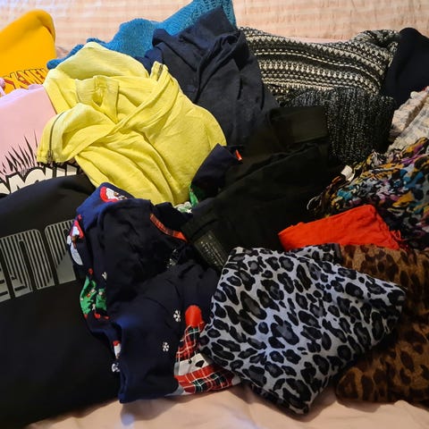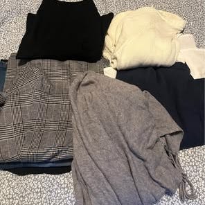 Klespakke til dame. 3 bukser, 4 topper og 1 skjerf. Alt i str L/XL. Noe har enda lappen på. Flotte klær.