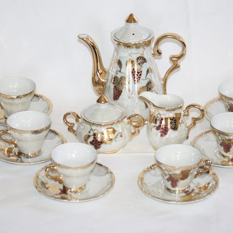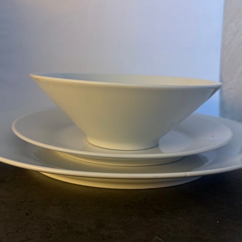 Består av seks dype tallerkener, fem middagstallerkener, fem vanlige tallerkener og seks kopper med fat. Kjøpt på Kremmerhuset rundt år 2000.
