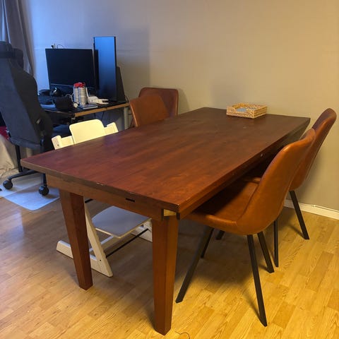 Det finnes mindre merker etter katt på enkelte stoler, men dette er lite synlig og påvirker ikke bruken.